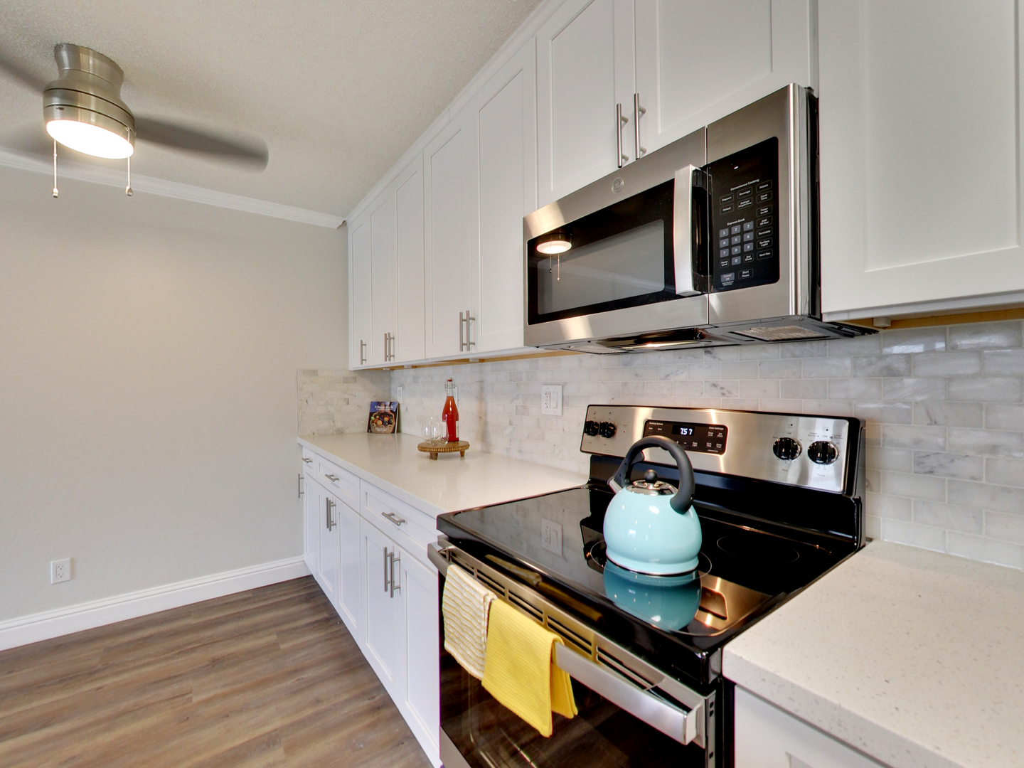 Remodeled 1 bedroom 1 bath unit featuring stainless steel appliances, granite countertops, new flooring, new carpet, tile bathroom and 2 oversized closets and back patio facing the building behind.